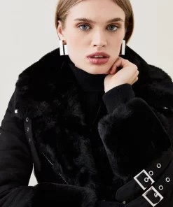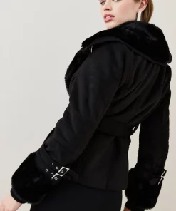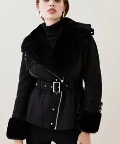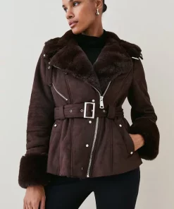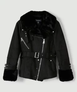 Boasting a soft faux shearling lining and cuffs, this biker jacket is complete with studs, buckled cuffs and a matching belt that flatters the figure. Wear it over a knitted top to keep warm when temperatures drop.