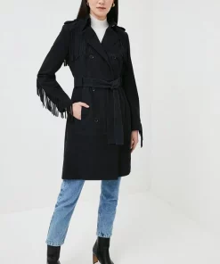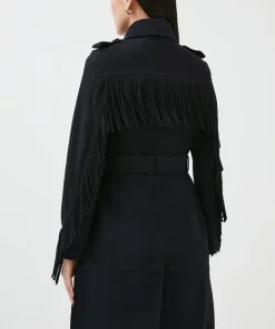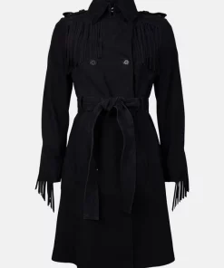 Take the enduring Western trend for a spin in this fringed trench coat. Cut from sumptuously soft suede and detailed with classic double-breasted buttons and a belt, it lends a casual twist to light-wash denim โ a directional alternative to your usual cotton trench.