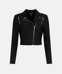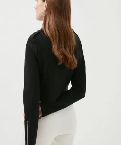 Accent tailored outfits with this polished bandage knit piece. A jacket with serious wearability, it shows off softly structured fabric that hugs the figure along with biker-style silver zips and notched lapels.