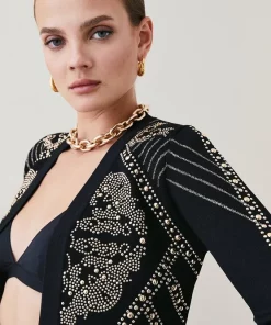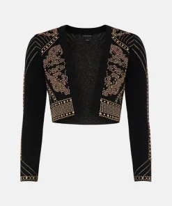 50% Viscose 44% Nylon $% Polyester 2% Metalised Fibre. Model wears Size S. Hand wash only.