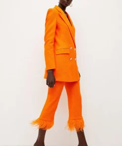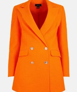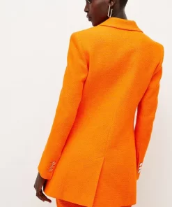 Timeless boucle takes a buoyant new direction for this bubblegum bright blazer. Equal parts classic and contemporary, it has classic tailored attributes, including a notched lapel, double-breasted front that secures with hammered silver tone buttons and matching cuffed sleeves. Pair with the matching tailored trousers for polished sartorial confidence.
