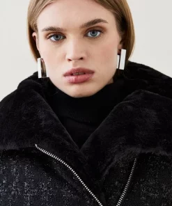 Main/Lining: 100% Polyester. Contrast: Polyurethane. Backing: 100% Polyester. Faux Fur 1: 100% Polyester. Wadding: 100% Polyester. Do not dry clean. Model wears UK 8/US 4. Model height: 5″9. Length measurement: 117cm.