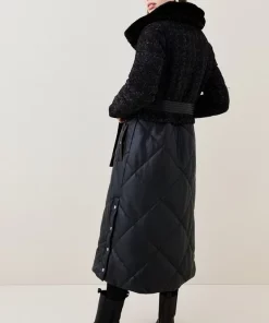 A contemporary iteration of the classic longline coat, this design features innovative contrasting fabrics. Faux fur shawl lapels ensure warmth in colder conditions, while also adding a touch of opulence. A boucle bodice adds classic appeal to the piece, beautifully juxtaposed by PU leather.