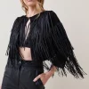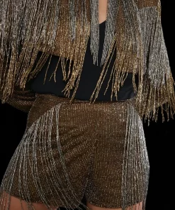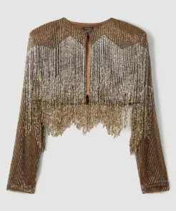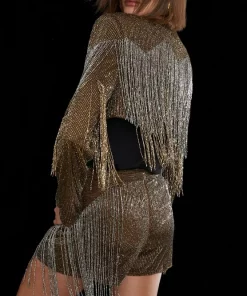 Scintillating with midnight mastery, this metallic jacket glimmers with dimensional detail. Woven with lustrous thread and intricate beading for an after-dark effect, it is characterised by embellished fringing that cascades languidly down the silhouette. Pair with the co-ordinating shorts to complete this showstopping look.