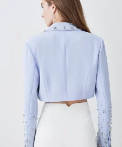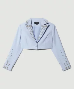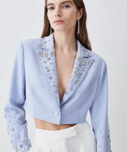 This blazer is adorned with glistening claw crystals across the notched lapels and sleeves, lending a touch of drama to classic occasionwear. Cut to a sharp, cropped silhouette, this piece exudes a clean aesthetic. Style this blazer with tailored trousers or layer over the co-ordinating dress.