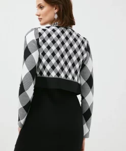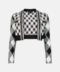 Harlequin checks may be playful, but this cropped jacket is undeniably polished too. Detailed with ruffled trims and long sleeves, this open-front cover-up is the perfect addition to all-black ensembles.