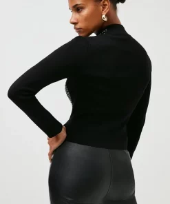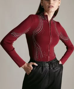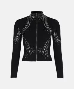 Bring an edgy twist to any ensemble with this figure-sculpting knitted bomber jacket.. Punctuated with glossy hotfix studs and a sporty front zip, this directional high-necked design makes a bold alternative to a denim jacket.
