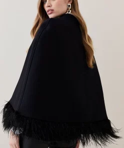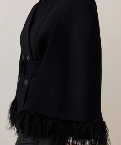 Trimmed with plumes of feathers for a touch of playful opulence, this cape coat promises to capture attention. This piece is adorned with classic double-breasted buttons and a buckle belt for a refined finish.