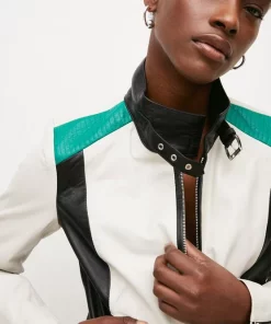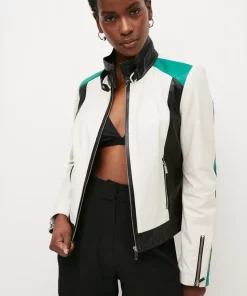 Embrace this seasons statement moto cross trend with this premium leather biker jacket. Elevated with a colour block detail along the zip, shoulders and arms, it comes in a slightly cropped fit, sitting just above the waist. Take it into the warmer season layered on top of a lightweight midi dress, or with fitted trousers as an all-weather combination.