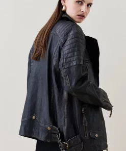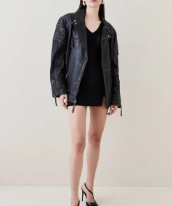Shell: Leather. Inner: 100% Polyester. Professional dry clean only. Model wears UK 8/US 4. Model height: 5″9. Length measurement: 68cm.