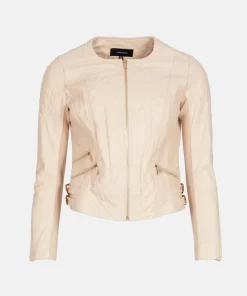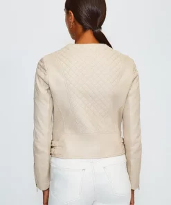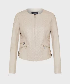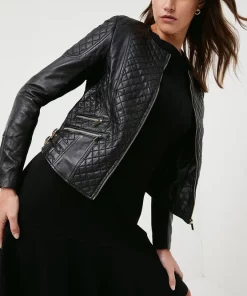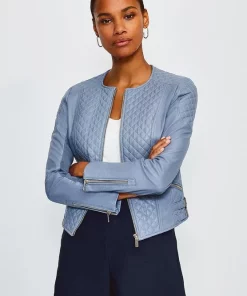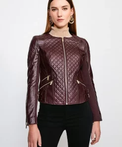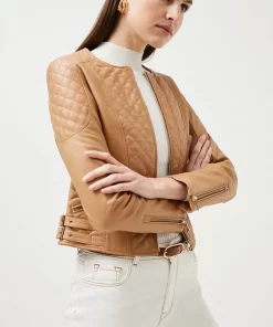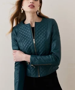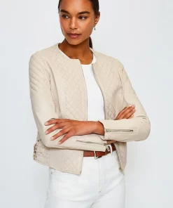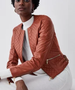 This quilted leather jacket is a total all-rounder; from running errands to a night out. The style is panelled for a tailored fit, so it looks good worn open or closed, while the round collarless neckline is an unfussy style. Quilted panelling creates interesting texture, and the look is finished with stretch rib-knit fabric at the side body and inside arms for comfort. Created in soft lambskin leather and satin lining.
