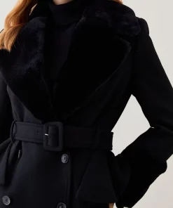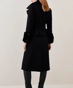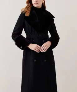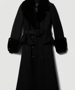 This luxurious coat combines the glamour of eras past with a contemporary perspective. Sheepskin shearling cuffs and lapels create an opulent mood, further emphasised by a premium Italian virgin wool blend. A buckle belt and flap details create a flattering hourglass effect, while double-breasted embossed buttons add the finishing touches.