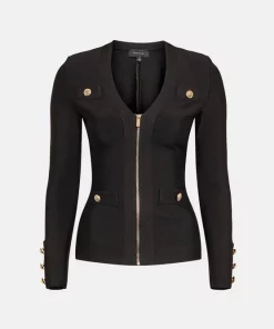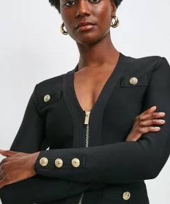 Crafted in a form-fitting bandage knit, this jacket is super versatile and super flattering. Whether worn zipped up or left open, your figure remains beautifully defined. Elevated by luxurious military buttons and textured trims, itll add polish to anything you pair it with.