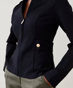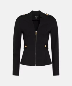Military with a twist; that’s the alluring vibe of this sleek ponte blazer, which features a zipped front, hardware-studded epaulettes and notched lapels. The neat fit and curve-contouring details make this a cover-up worth coveting.