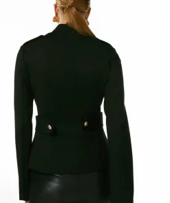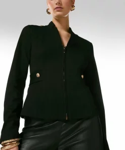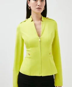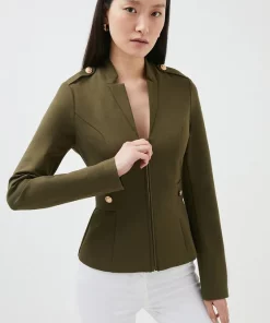 Military with a twist; thatβs the alluring vibe of this sleek ponte blazer,, which features a zipped front, hardware-studded epaulettes and notched lapels. The neat fit and curve-contouring details make this a cover-up worth coveting.