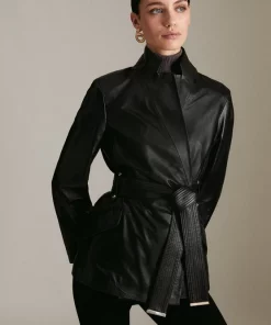 Take the spotlight and uplift your AW21 wardrobe with this luxurious coat.. Crafted in sumptuously soft leather for your comfort, it boasts a structured silhouette with a tied waist belt and silver-toned stud detailing.