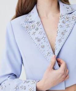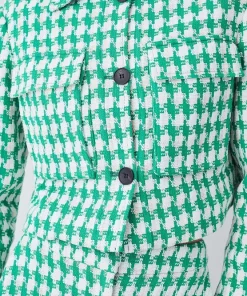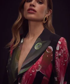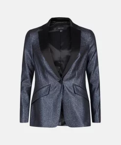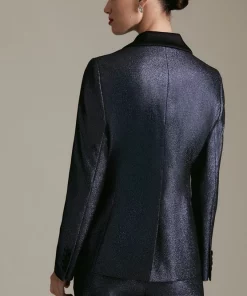 A bold new take on the tuxedo jacket, this gleaming metallic design showcases comfortable stretch jacquard fabric and a sharply tailored fit. Defined by contrast labels and flap pockets, it buttons neatly with a single closure and offers endless after-dark allure. Add slicked-back hair and red lipstick for dramatic dress codes.