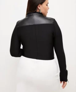Merging heritage equestrian design with touches of tactile leather, this hybrid jacket is a forward-thinking favourite. It has a bandage construction that creates a streamlined silhouette with a point collar, zip front and side pockets. With piped trims and panelling to the shoulders, pair with leather trousers and a red lip for a modern, moto-inspired look.