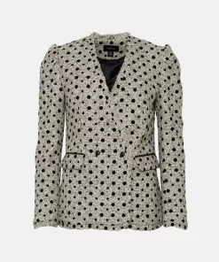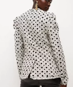 Summer work dressing, sorted in seconds. This smart cotton-blend boucle jacket is emboldened with playful polka dots, enhancing an otherwise classic silhouette. Double-breasted black buttons and flap pockets frame the front, offsetting gently puffed shoulders and long sleeves.