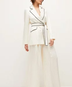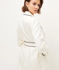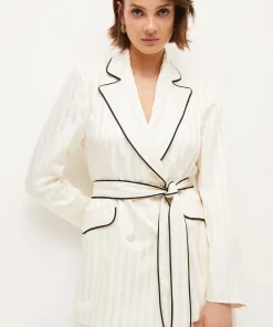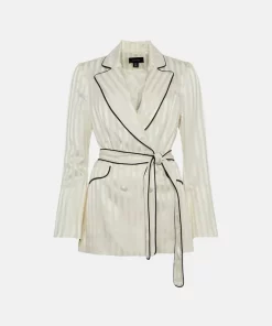 The epitome of effortless luxury, this sumptuously soft satin jacket makes an elevated addition to your tailoring wardrobe. In a draped, belted cut, it shows off a subtle shine complemented with a tonal stripe detail as a considered detail. Modern black piped trims add a dash of drama to the curved lapels, belt and flap pockets. Wear with a simple cami top and matching trousers for a timeless combination.
