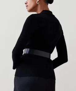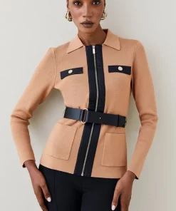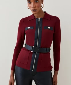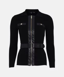 Designed for those who favour a demure sense of style, this luxe knitted jacket features faux leather trims and a front zip for a dash of daring finesse. Cut close to the figure and trimmed with a collar and patch pockets, it blends the practical with the polished. Tighten the utilitarian buckled belt to cinch in your waist when layering it over a ladylike pencil skirt.