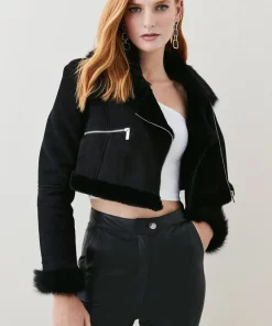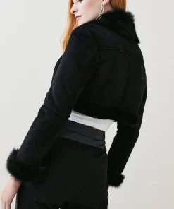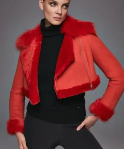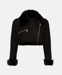 A contemporary take on the classic sheepskin jacket, this piece is designed in a cropped biker silhouette. Shearling trimmed cuffs and lapels add a sumptuous feel to this edgy piece.