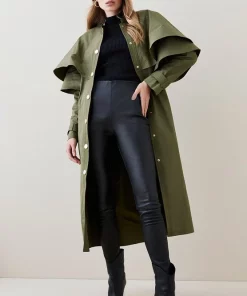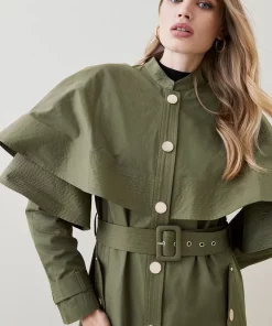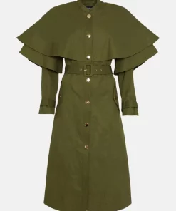 The timeless trench coat, reimagined. Boasting dramatic layers that drape, cape-like, over the shoulders, this cotton-blend design brings a sense of drama to cooler climes. Traditional design details abound elsewhere โ think gold buttons, belted cuffs and buttoned pockets โ adding an air of timeless versatility to this bold, belted cover-up.