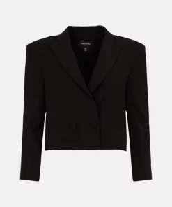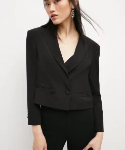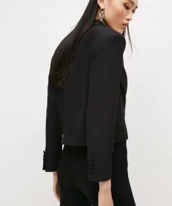 Workwear with a directional twist. Our bold, colourful jacket marries padded shoulders with a cropped, boxy fit and fabric-covered buttons. Inspired by the era of 1980s power dressing, it pairs perfectly with smartly tailored trousers and spike-heel stilettos for a confident work look.