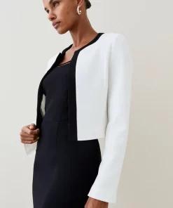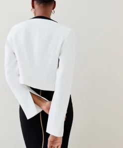 Statuesque and contemporary, this cropped jacket is a streamlined addition to the well-curated collection. Composed of structured crepe for a bespoke fit, this elegant silhouette boasts a piped trim for a classic twist.