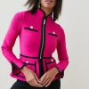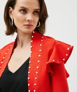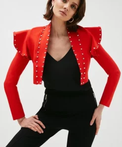 Let this vibrant red studded jacket be the statement piece when styling an outfit. The cropped style is tailored with an open front and features a shawl collar lined with polished metal studs and frills over the shoulders, also hemmed with studs. Pair with a simple tee and trouser combo for maximum effect.