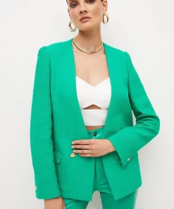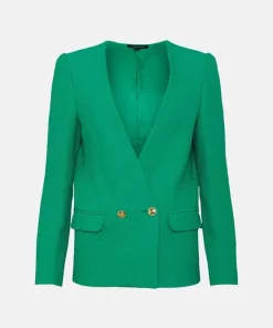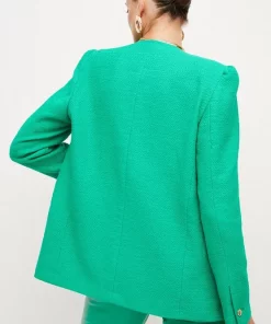 Crafted from cotton-blend fabric for a light, summery finish, this tailored jacket is perfect for warm work days. It shows off a clean-lined, collarless fit for added modernity along with glossy gold button closures, flap pockets and long, buttoned sleeves.