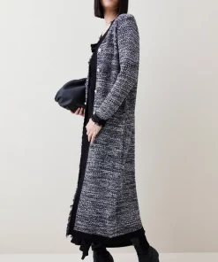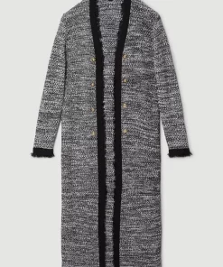Elegant tweed will take you from season to season with streamlined aplomb. This longline jacket is imbued with military detailing, complete with embossed buttons on the front.