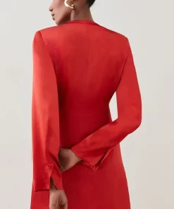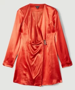 Crafted from lustrous satin that brilliantly gleams in the light, this blazer dress makes an elegant choice for both day and night styling. Gold clasps on the waist create a flattering ruched effect, while a plunging V-neckline create the perfect canvas for an opulent necklace.